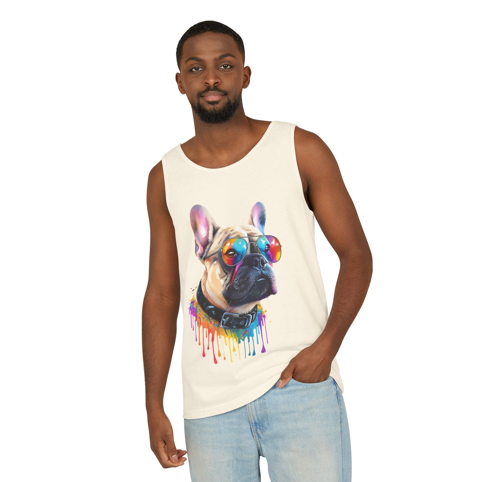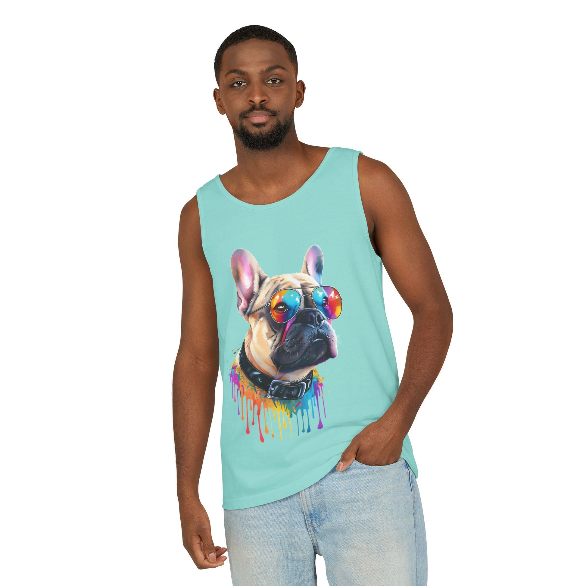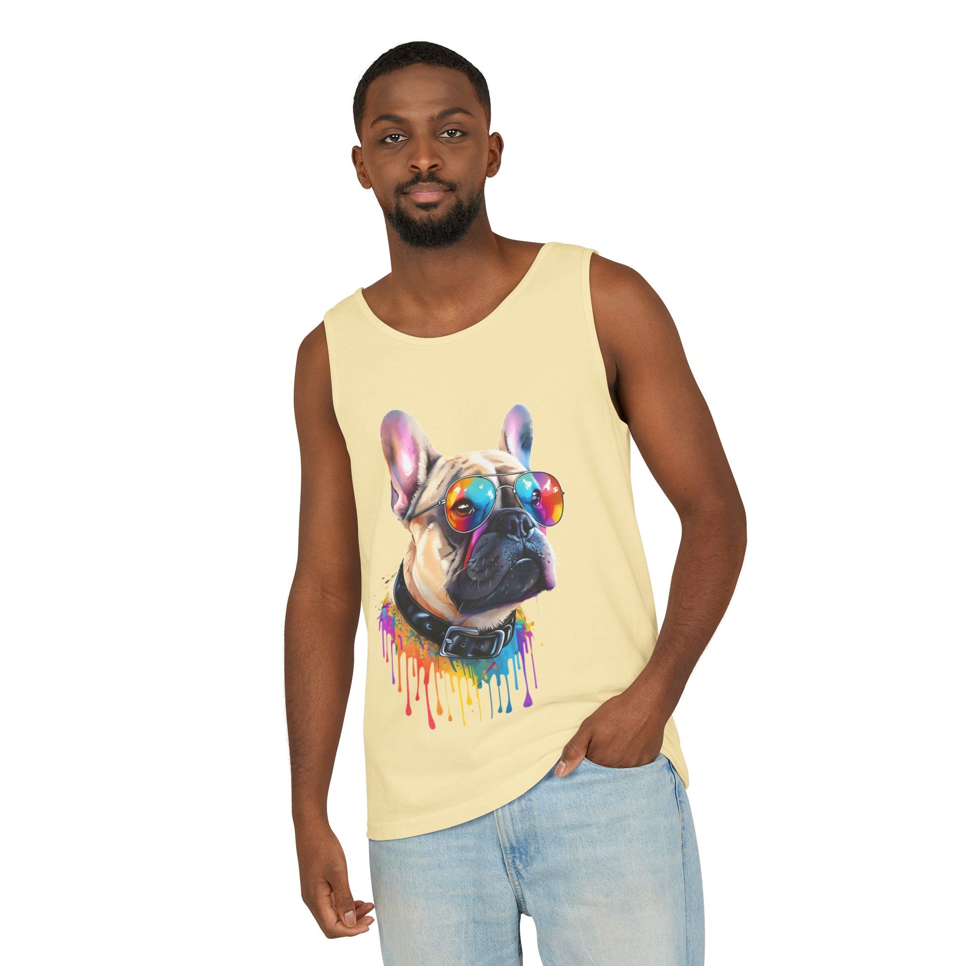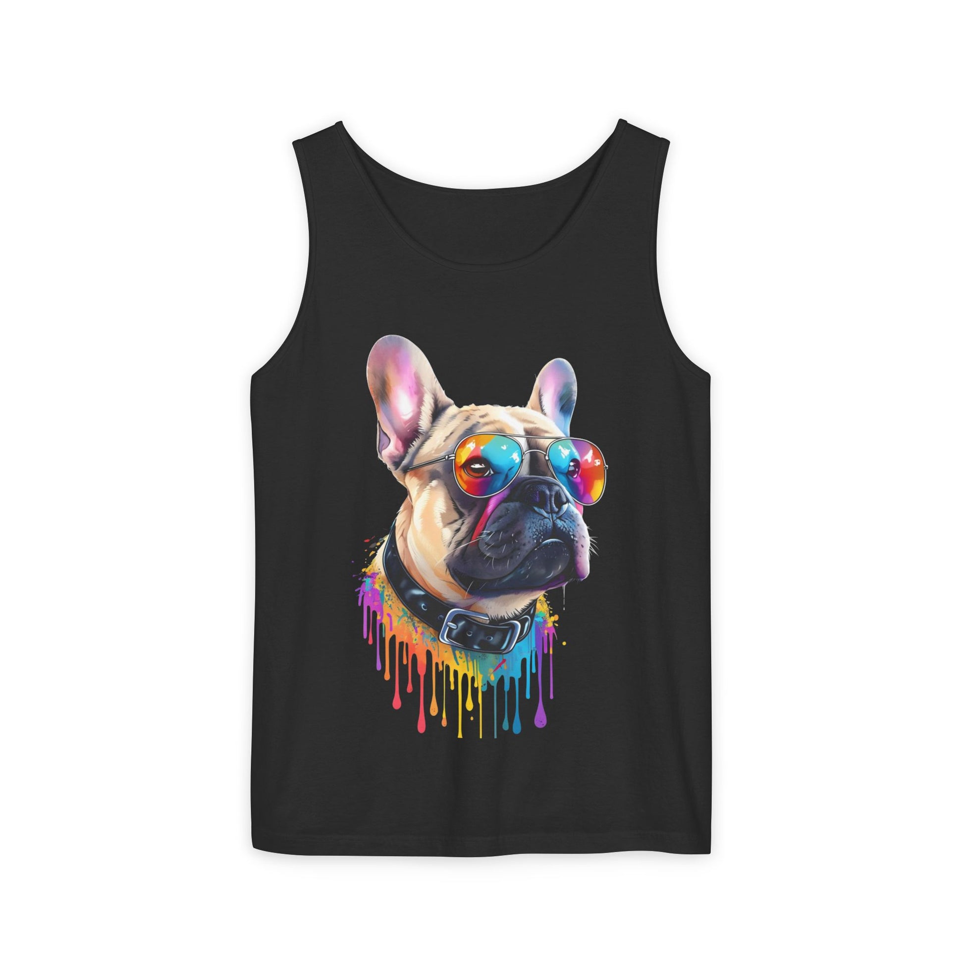Introducing the perfect companion for warm, sunny days: our stylish Unisex French Bulldog Art Tank Top featuring a trendy dog graphic design. This eye-catching tank top showcases a distinctive French Bulldog with cool blue sunglasses and vibrant rainbow drip artwork that makes a bold fashion statement. This garment-dye