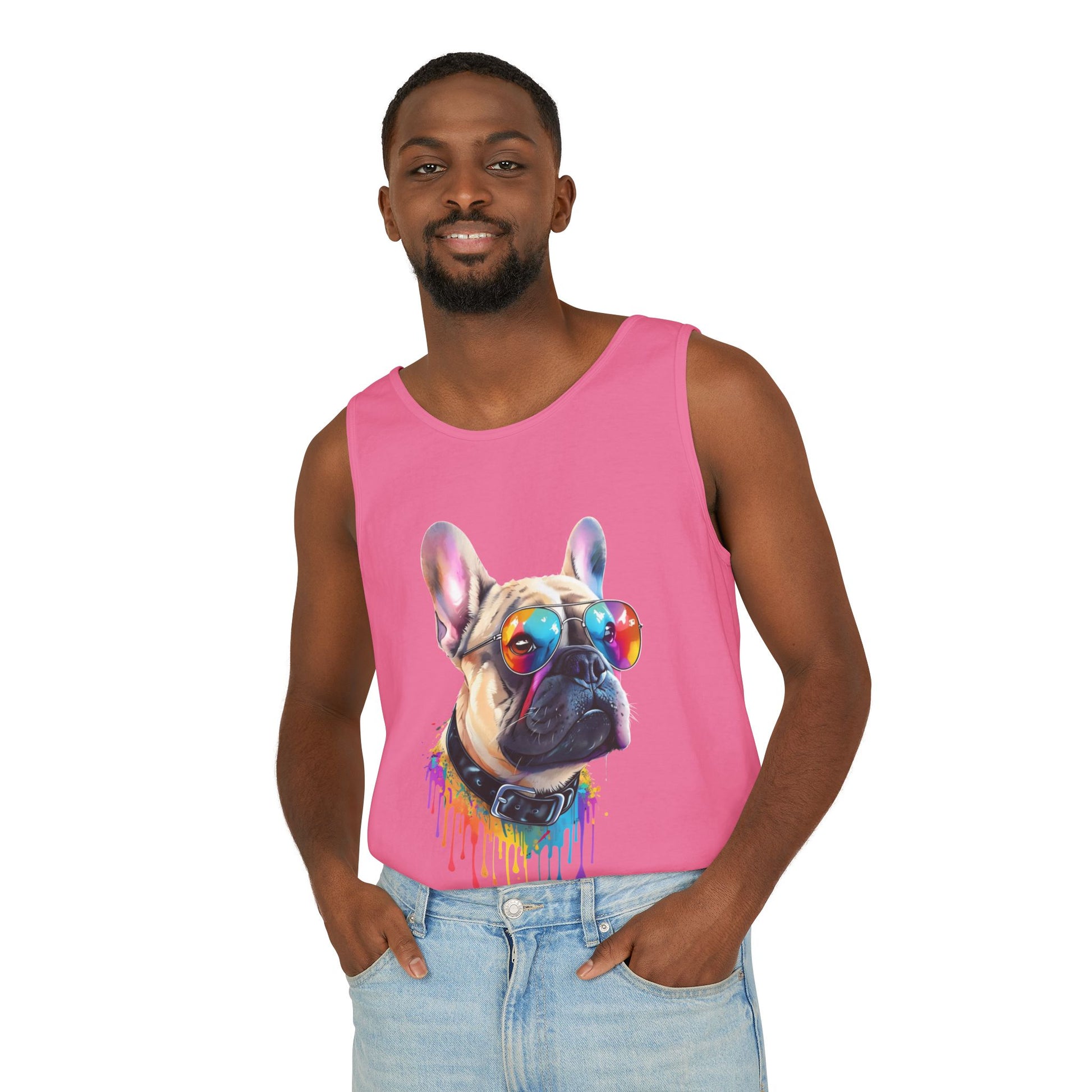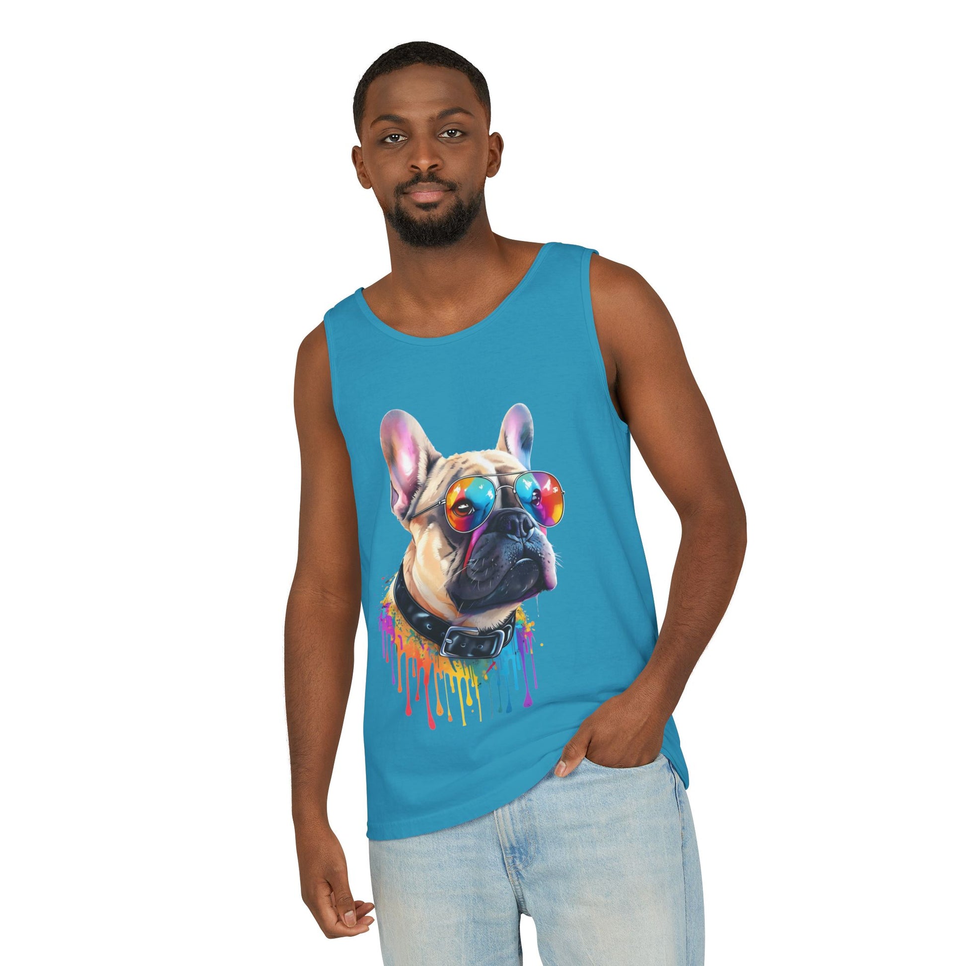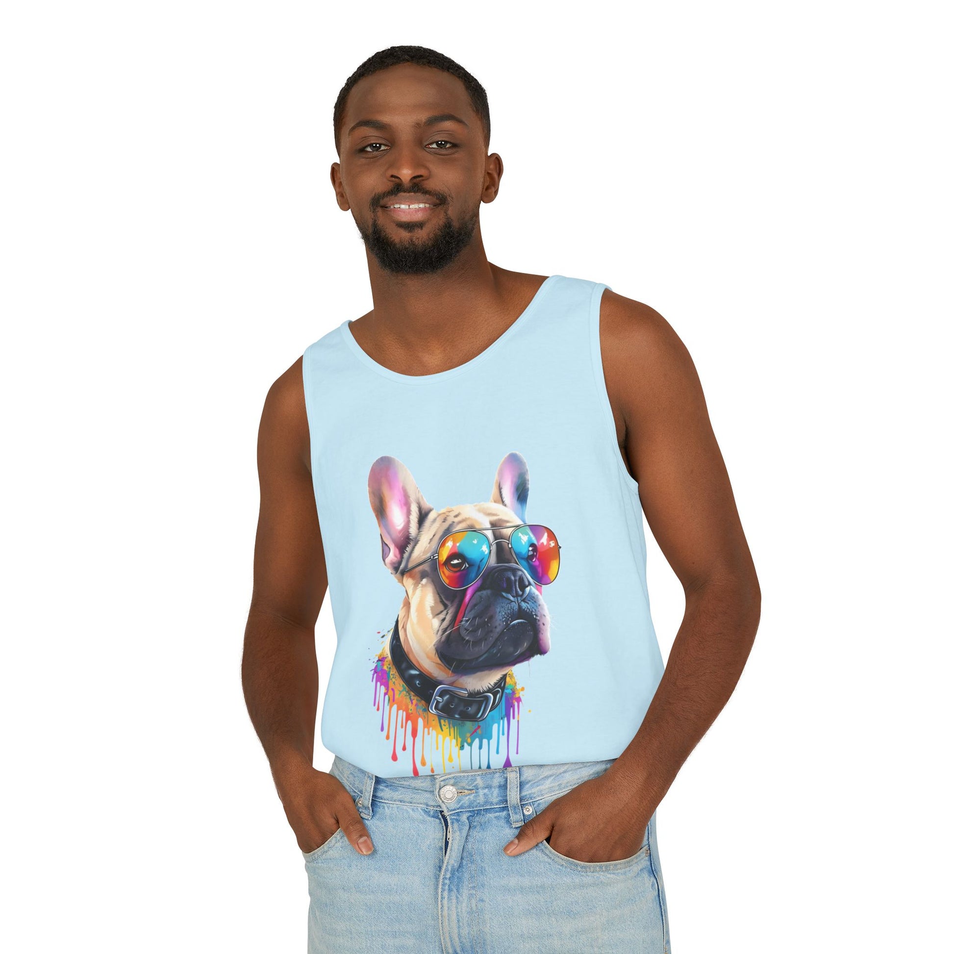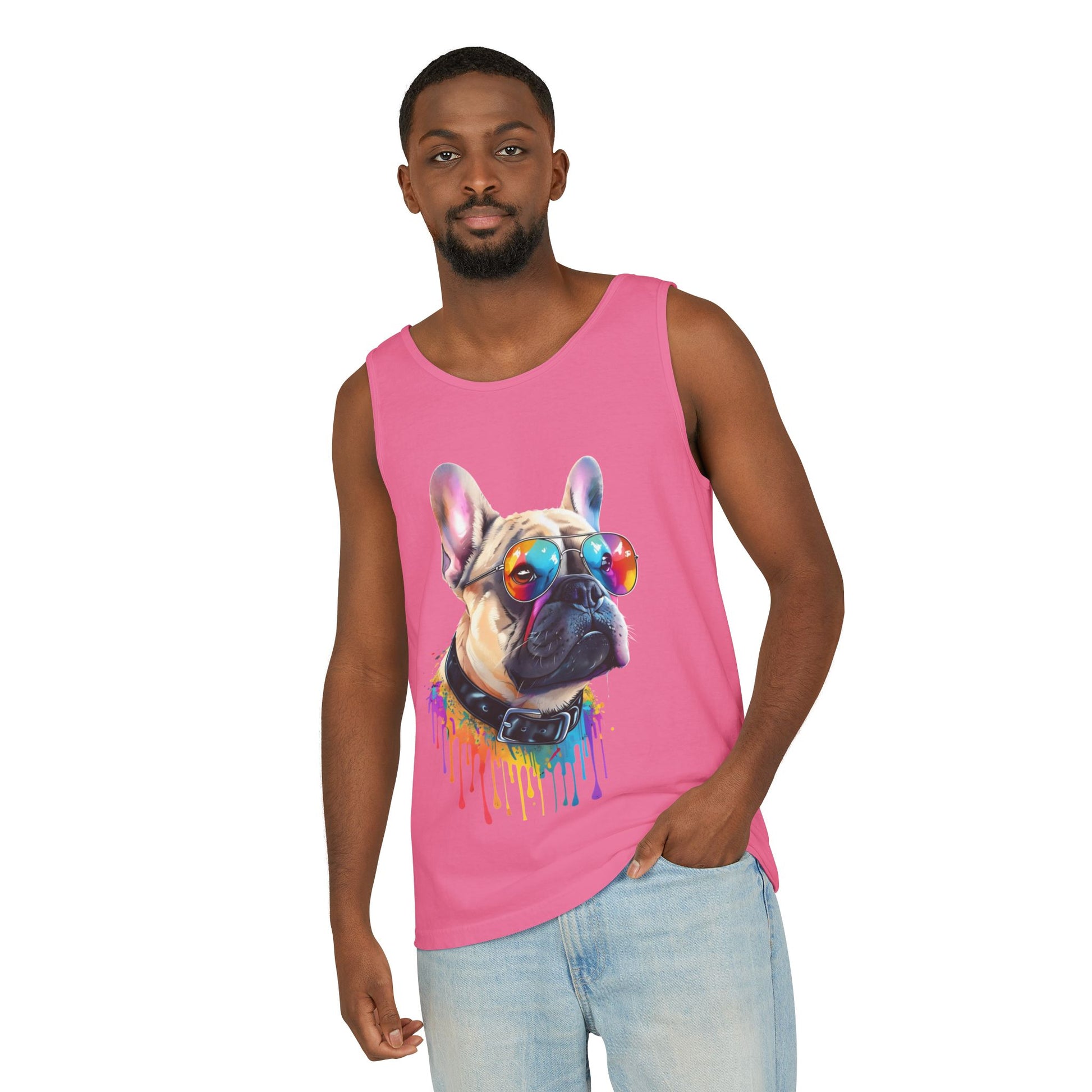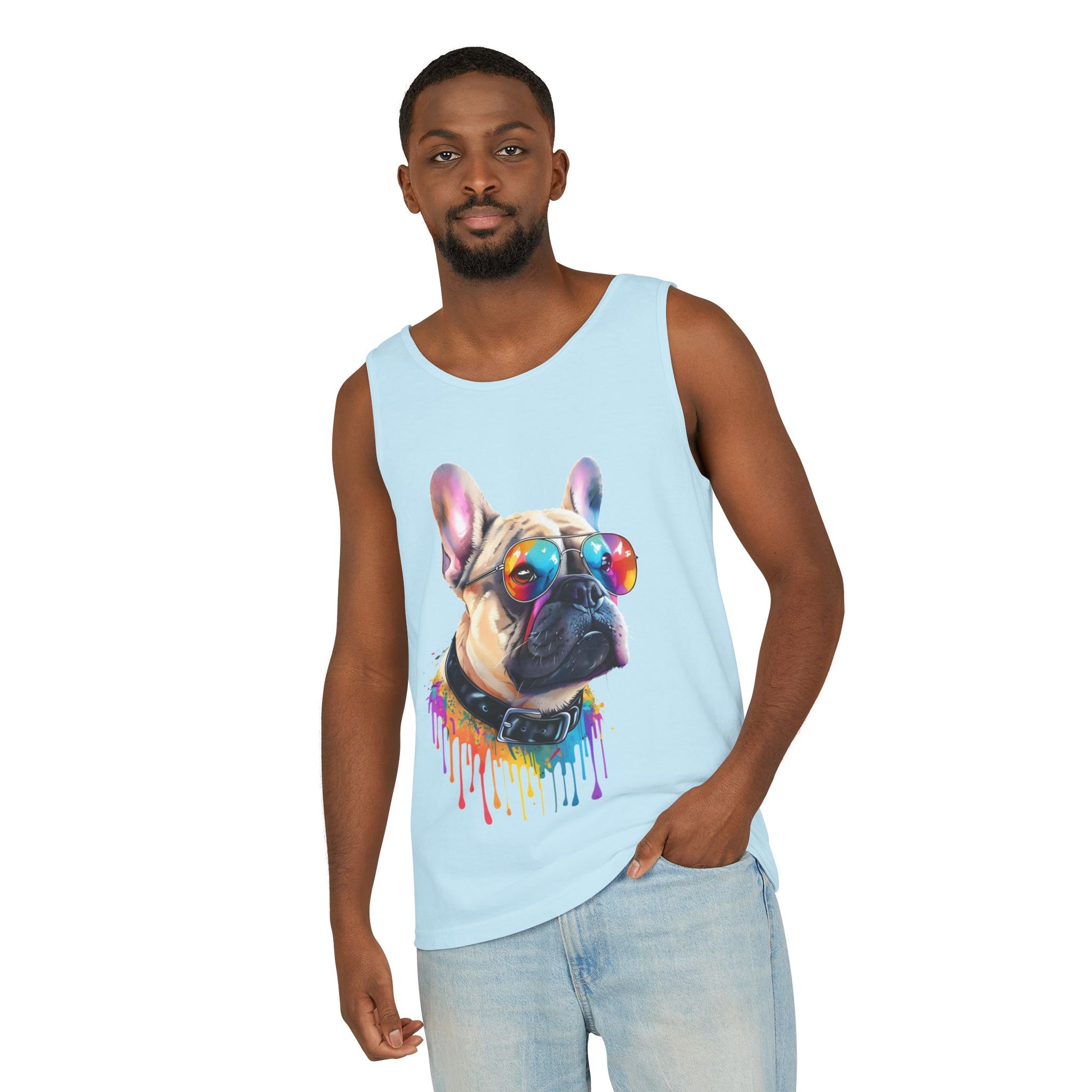 Introducing the perfect companion for warm, sunny days: our stylish Unisex French Bulldog Art Tank Top featuring a trendy dog graphic design. This eye-catching tank top showcases a distinctive French Bulldog with cool blue sunglasses and vibrant rainbow drip artwork that makes a bold fashion statement. This garment-dye