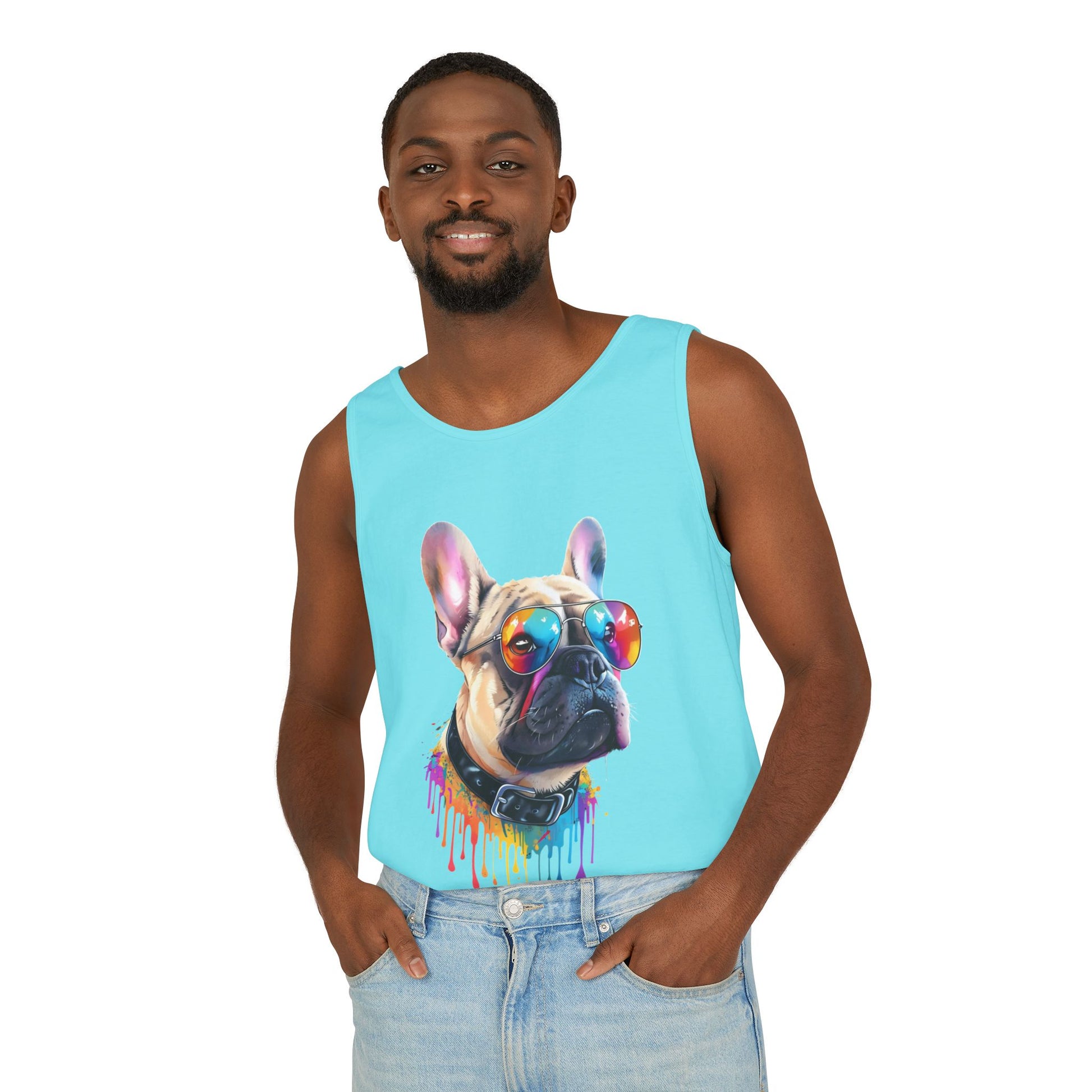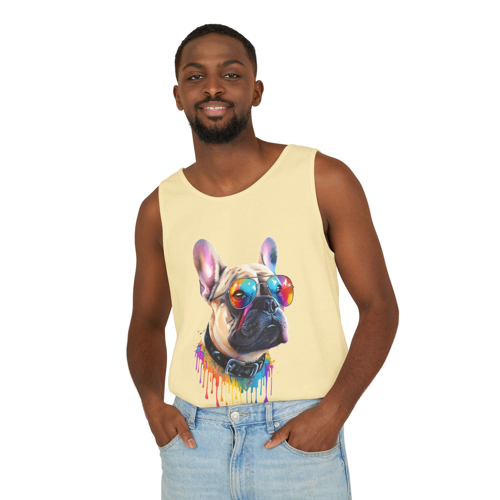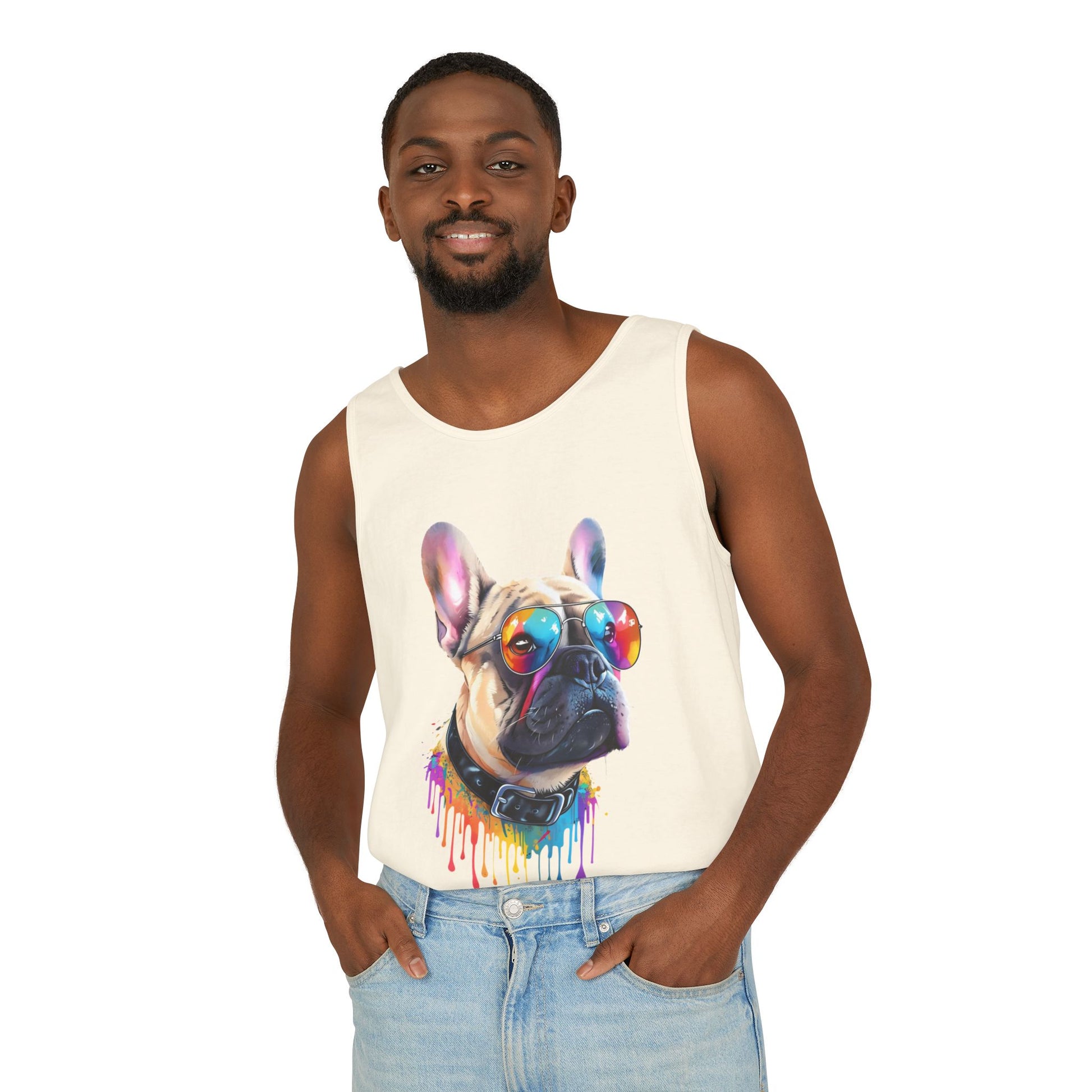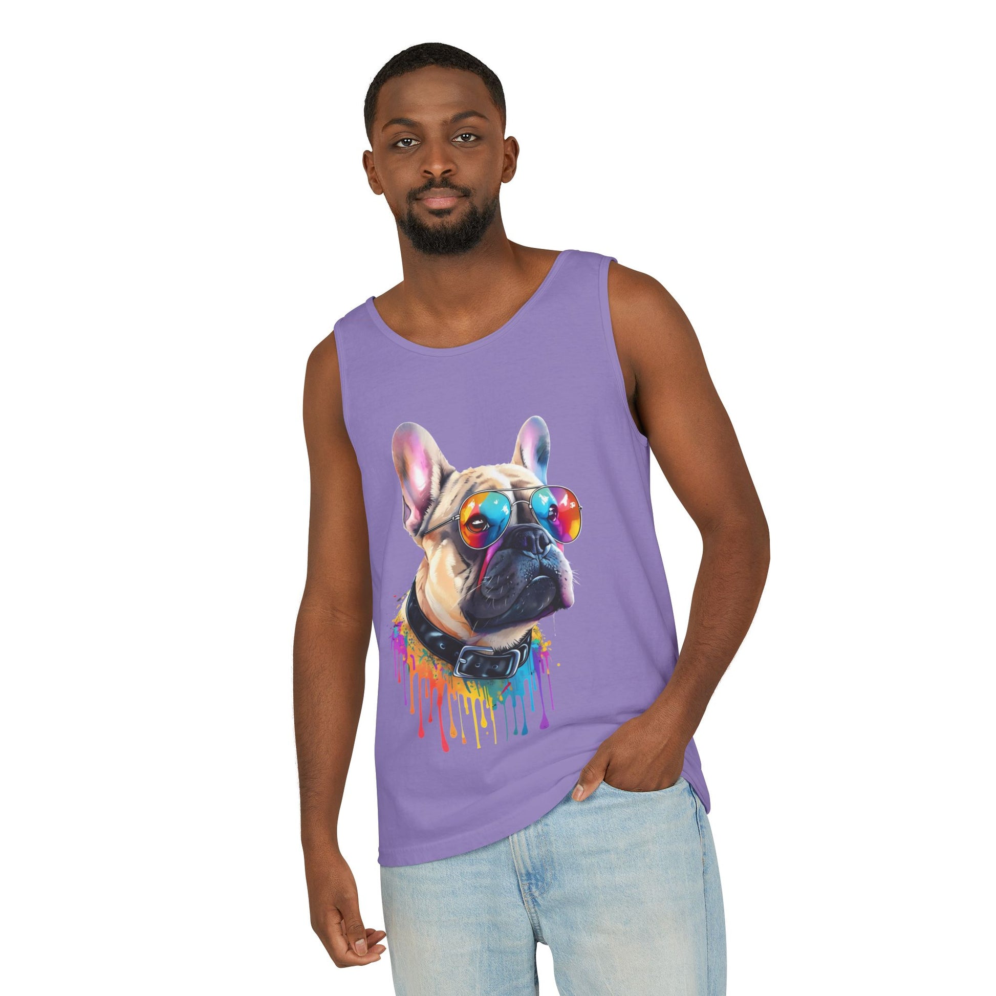 Introducing the perfect companion for warm, sunny days: our stylish Unisex French Bulldog Art Tank Top featuring a trendy dog graphic design. This eye-catching tank top showcases a distinctive French Bulldog with cool blue sunglasses and vibrant rainbow drip artwork that makes a bold fashion statement. This garment-dye