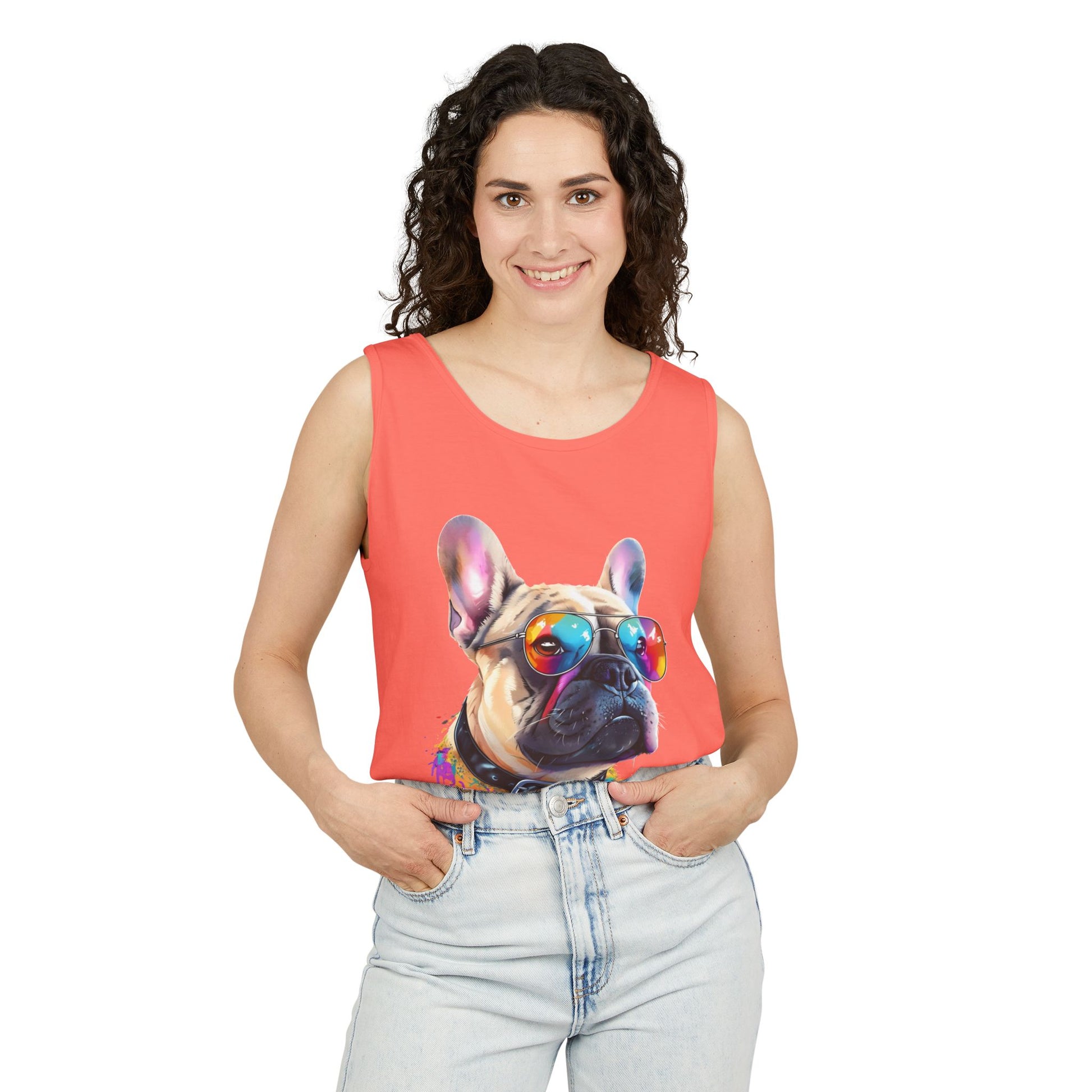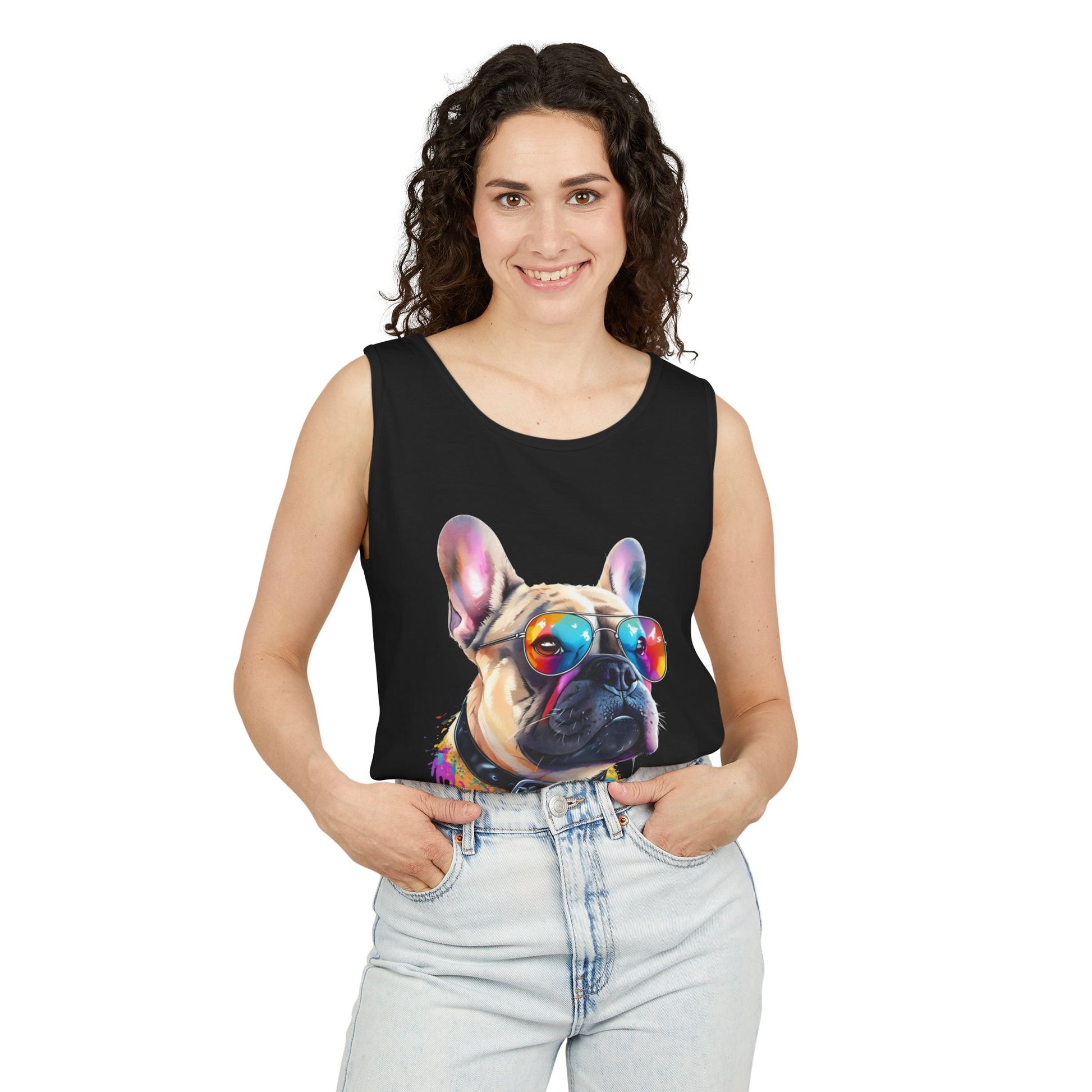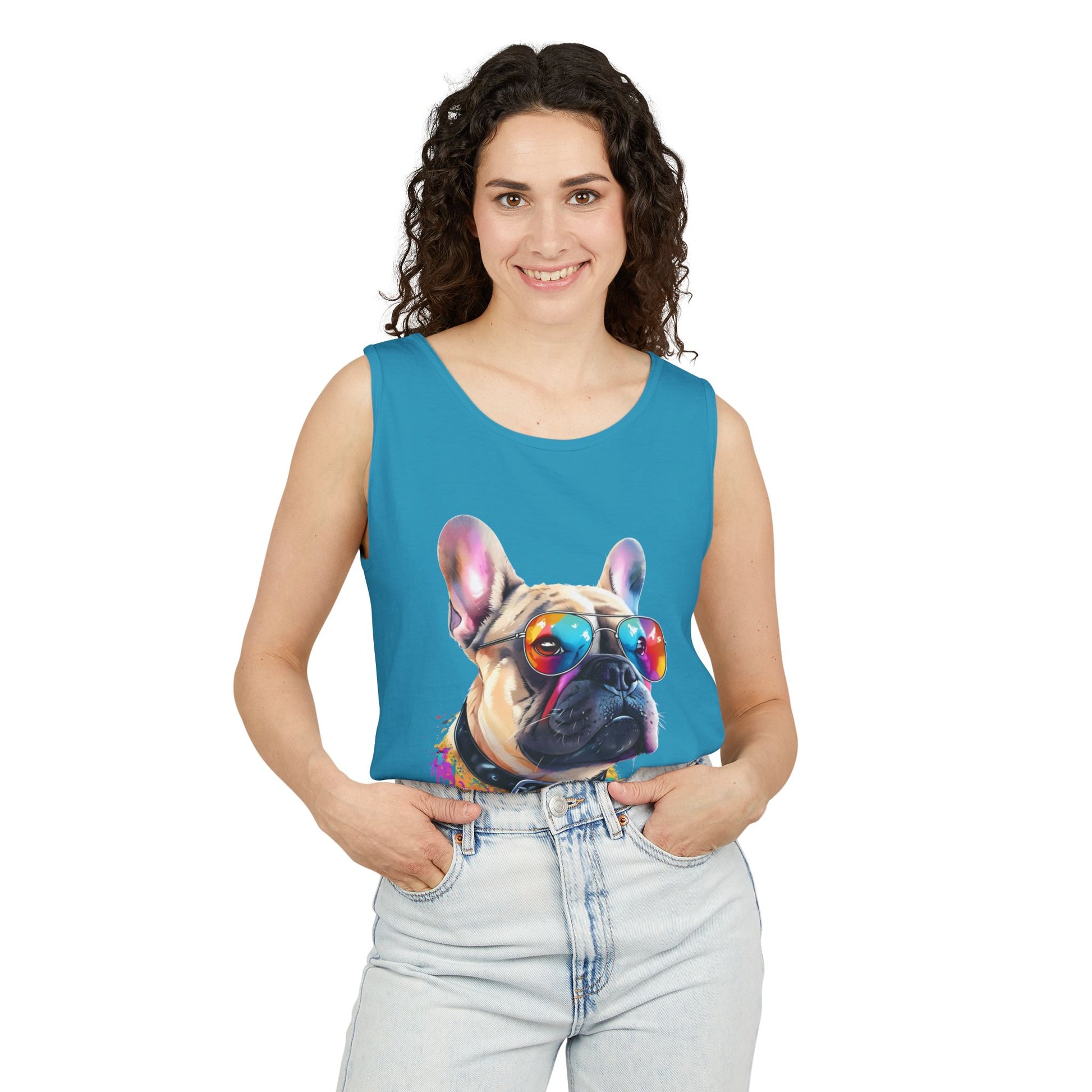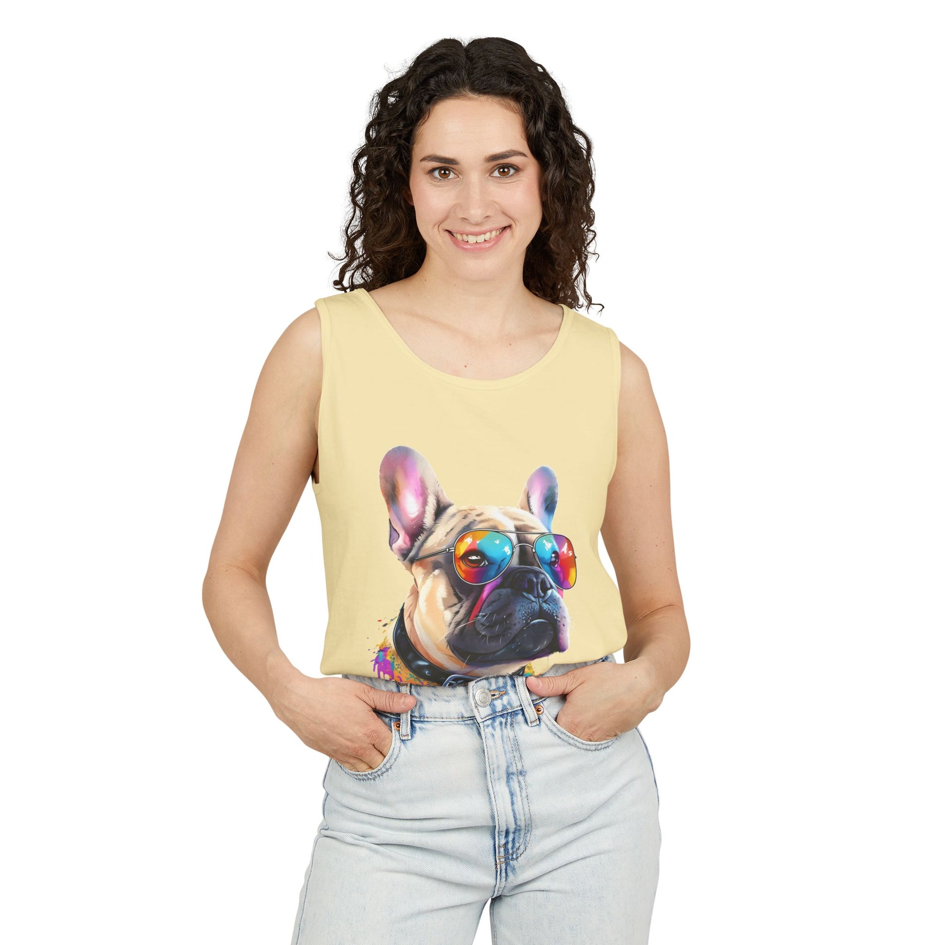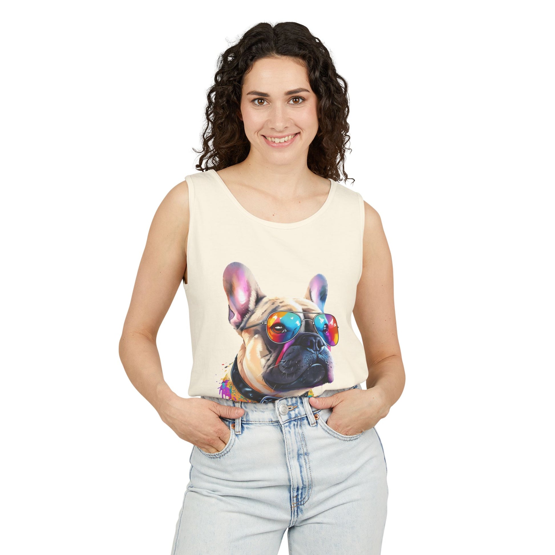This garment-dyed tank top combines comfort and fun, ideal for casual outings or relaxed gatherings. Whether you're at the beach, enjoying a picnic, or hanging out with friends, this top adds a vibrant touch to your summer wardrobe. It's perfect for dog lovers, French Bulldog owners, art enthusiasts, or anyone who enjoys expressing their personality through fashion.