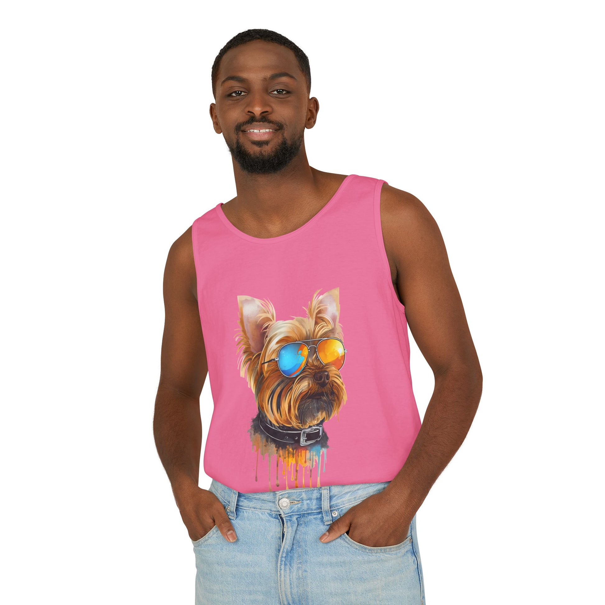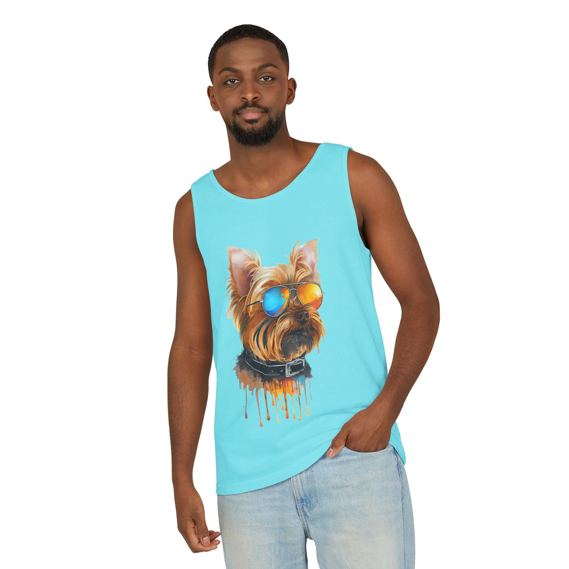 Introducing the perfect companion for warm, sunny days: our stylish Unisex Yorkie Art Tank Top featuring a trendy dog graphic design. This eye-catching tank top showcases a distinctive Yorkie with cool blue sunglasses and vibrant rainbow drip artwork that makes a bold fashion statement. This garment-dyed tank top combi